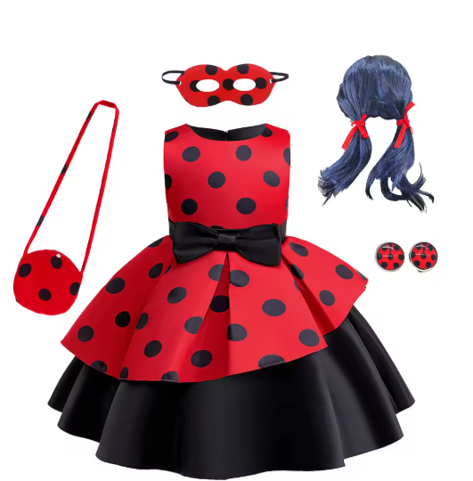 الفتيات Ladysbug تأثيري فستان الأميرة الطفل الأحمر البولكا نقطة طباعة القوس الفساتين الاطفال عيد ميلاد كرنفال عيد الميلاد حفلة تنكرية